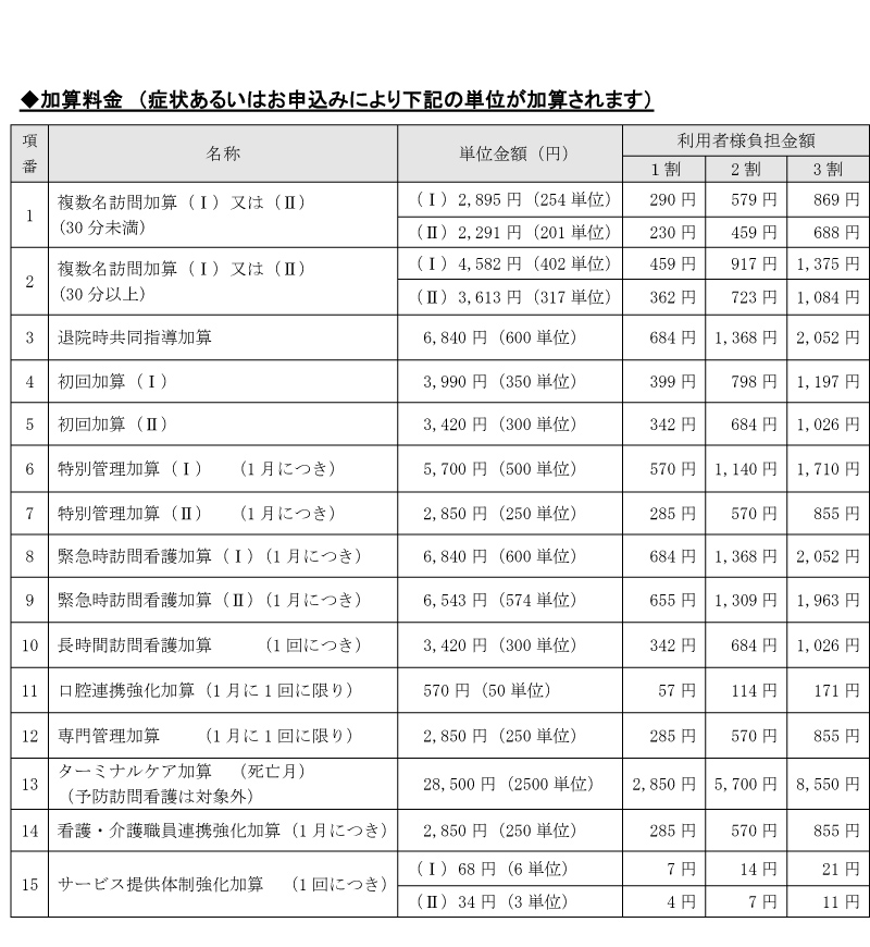 医療保険をご利用の場合は保険の種類によって異なります。料金は身体状態や処置の内容、難病指定を受けているかなどにより異なります。大まかな金額となりますが、ご参考にしてください。詳細は事業所にご相談ください。